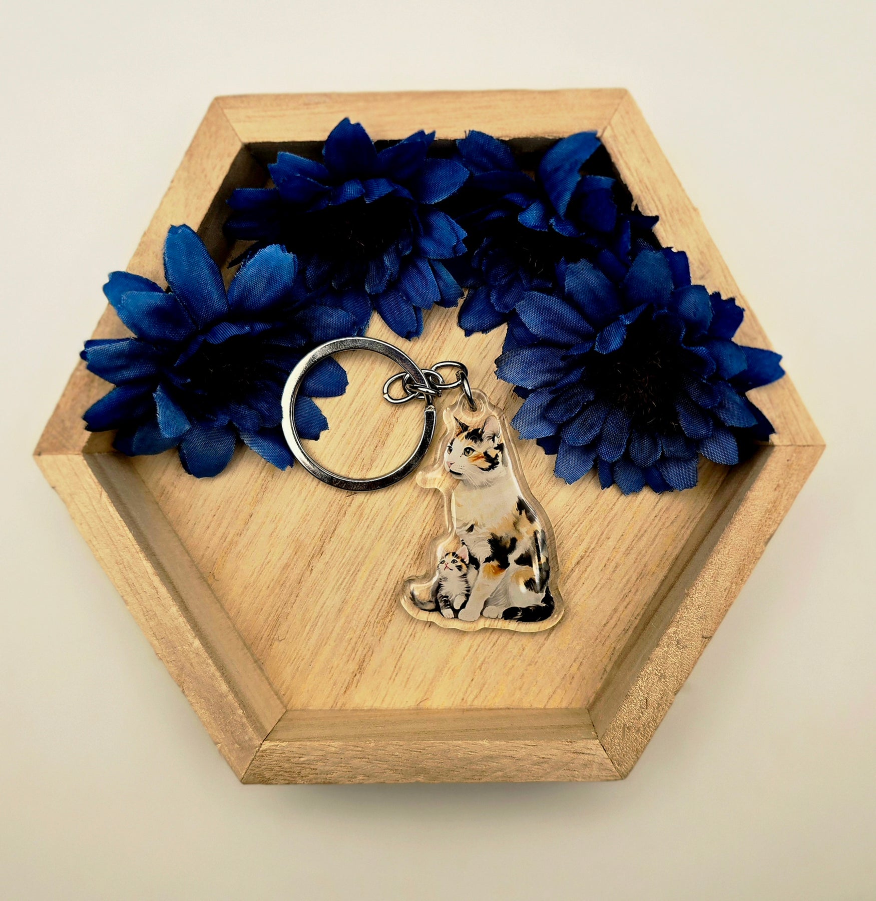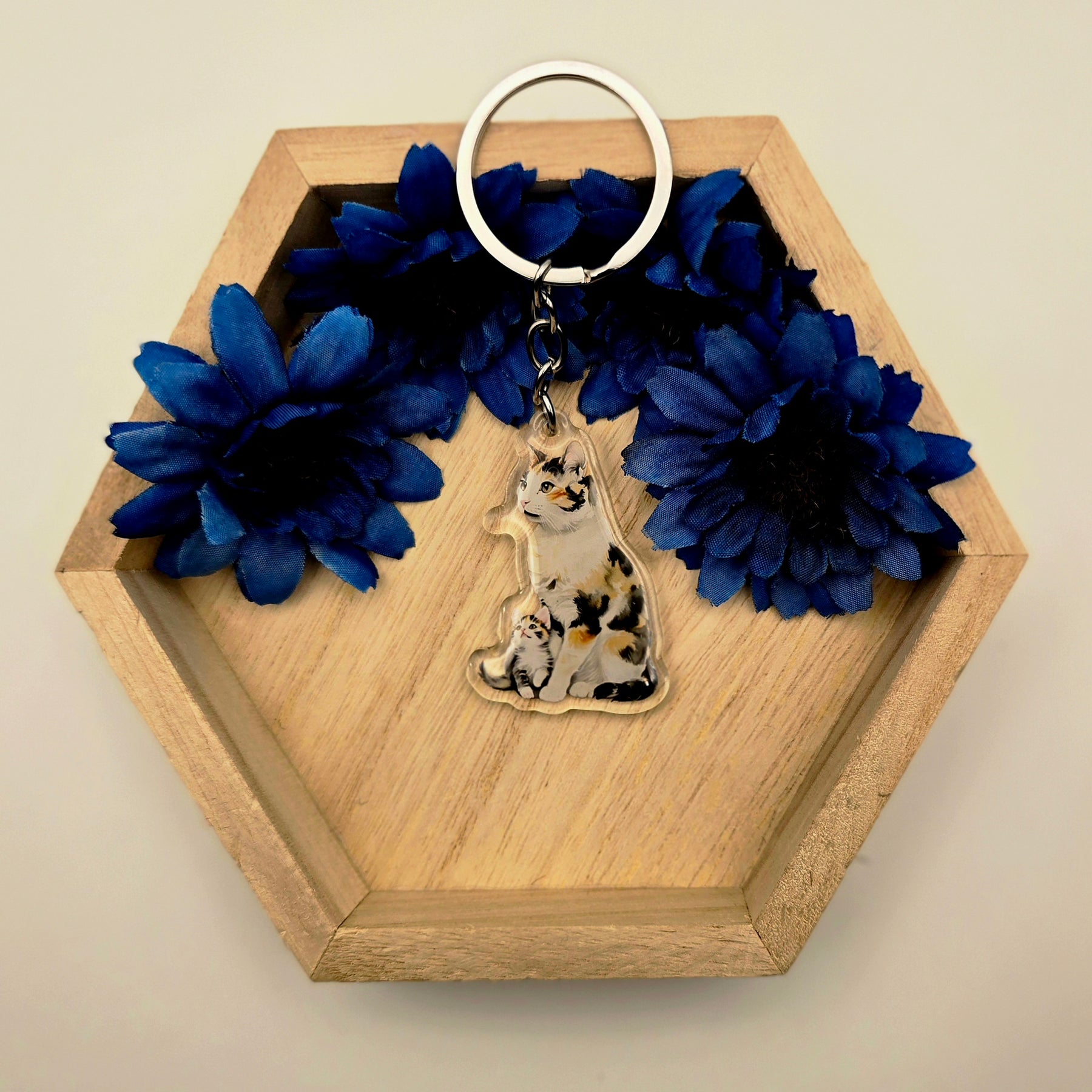 Celebrate the sweet bond between a calico cat and her kitten with this handmade acrylic keychain! Featuring a beautiful calico cat sitting proudly with her little one gazing up in admiration, this photo-style charm is perfect for cat moms, animal lovers, and anyone who adores feline companionship.