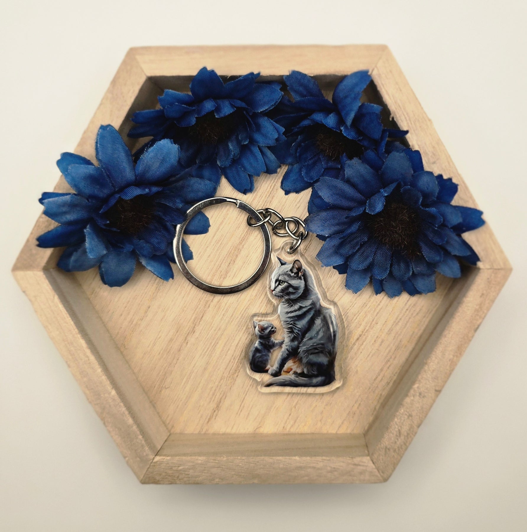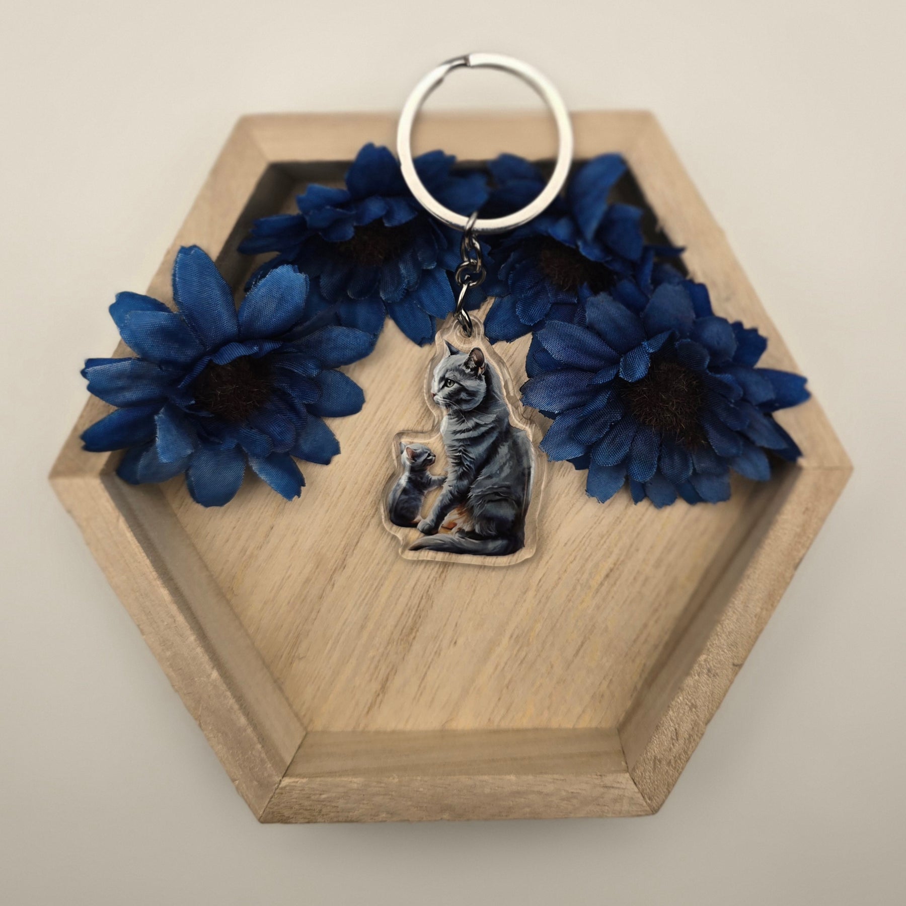Russian Blue Cat and Kitten Keychain, Acrylic Cat Mom Charm, Gray Cat Lover Gift, Pet Key Ring - Designs by Mysh