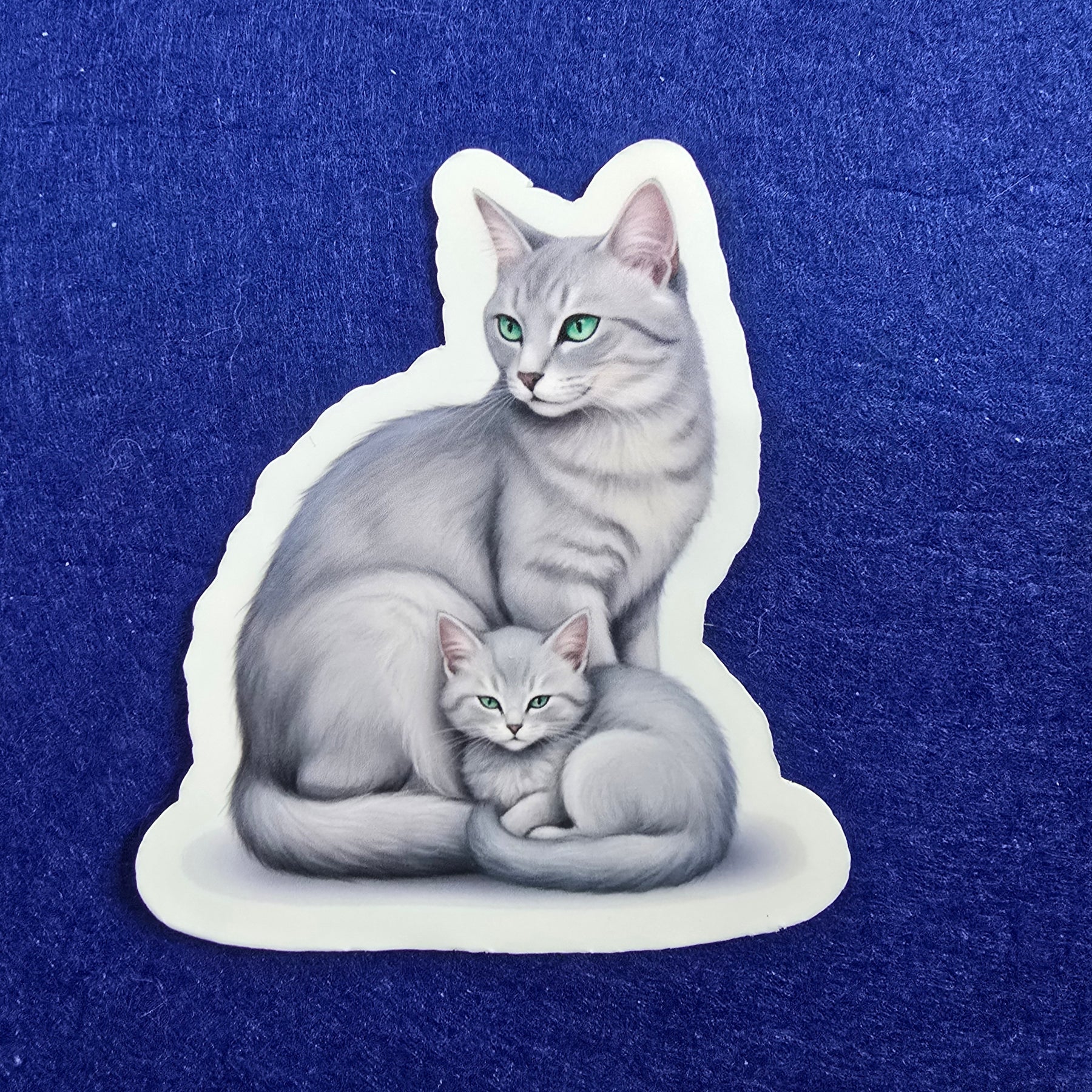 Celebrate the grace and charm of Russian Blue cats with this beautifully detailed vinyl sticker featuring a serene mama cat and her attentive kitten. Rendered in a soft watercolor style with blue-gray tones, this sticker brings calm elegance to any surface.