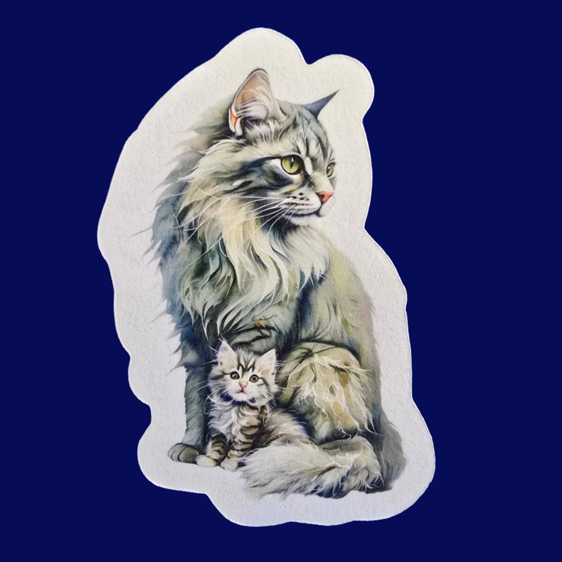 Capture the majestic charm of the Norwegian Forest cat with this beautifully detailed vinyl sticker! Featuring a fluffy mama cat and her sweet kitten in a soft watercolor style, this sticker brings a woodland fairytale feel to your everyday items.