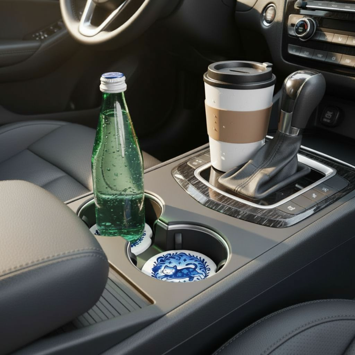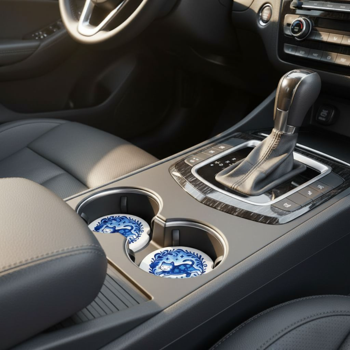 Made from durable, absorbent ceramic, these coasters protect your cup holders from moisture and spills. Designed to fit most standard car cup holders, each coaster includes a convenient side notch for easy removal. The vibrant blue-on-white design brings joy and personality to your daily drives.