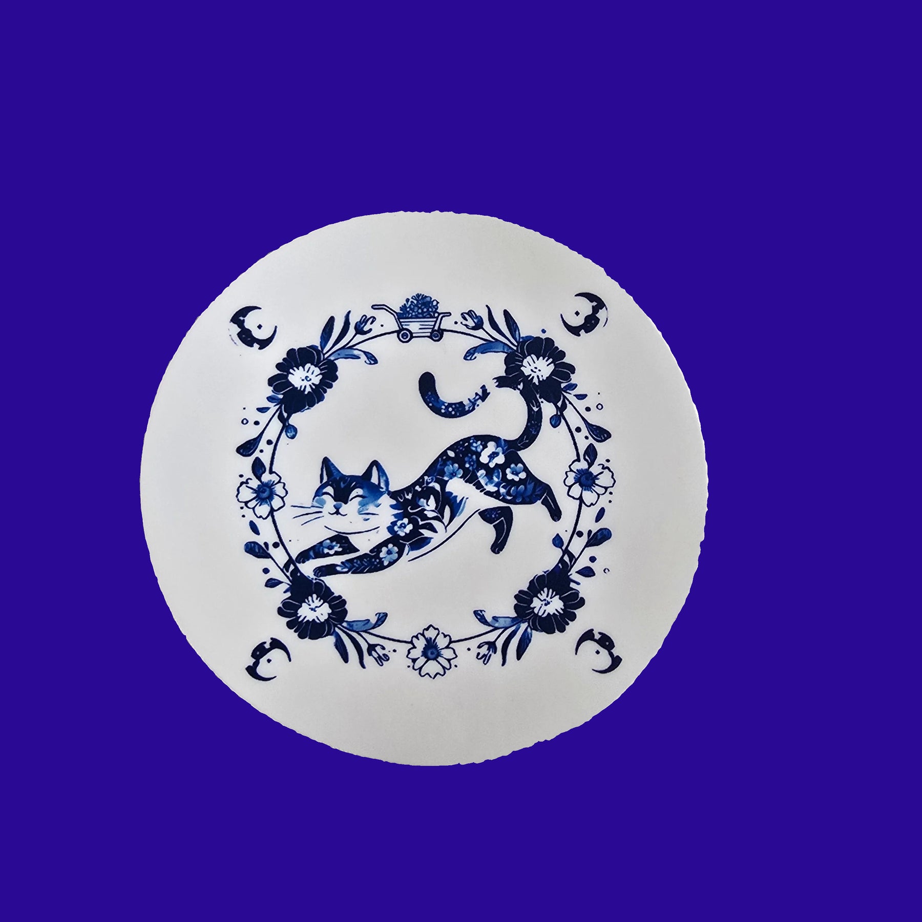 Celebrate feline grace with a touch of artistic charm with our Blue Floral Cat Sticker. This unique design features a playful cat adorned in an intricate blue floral pattern, surrounded by a delicate ring of matching blooms and crescent moons. The design evokes a porcelain or Delftware style, combining whimsy with elegance.