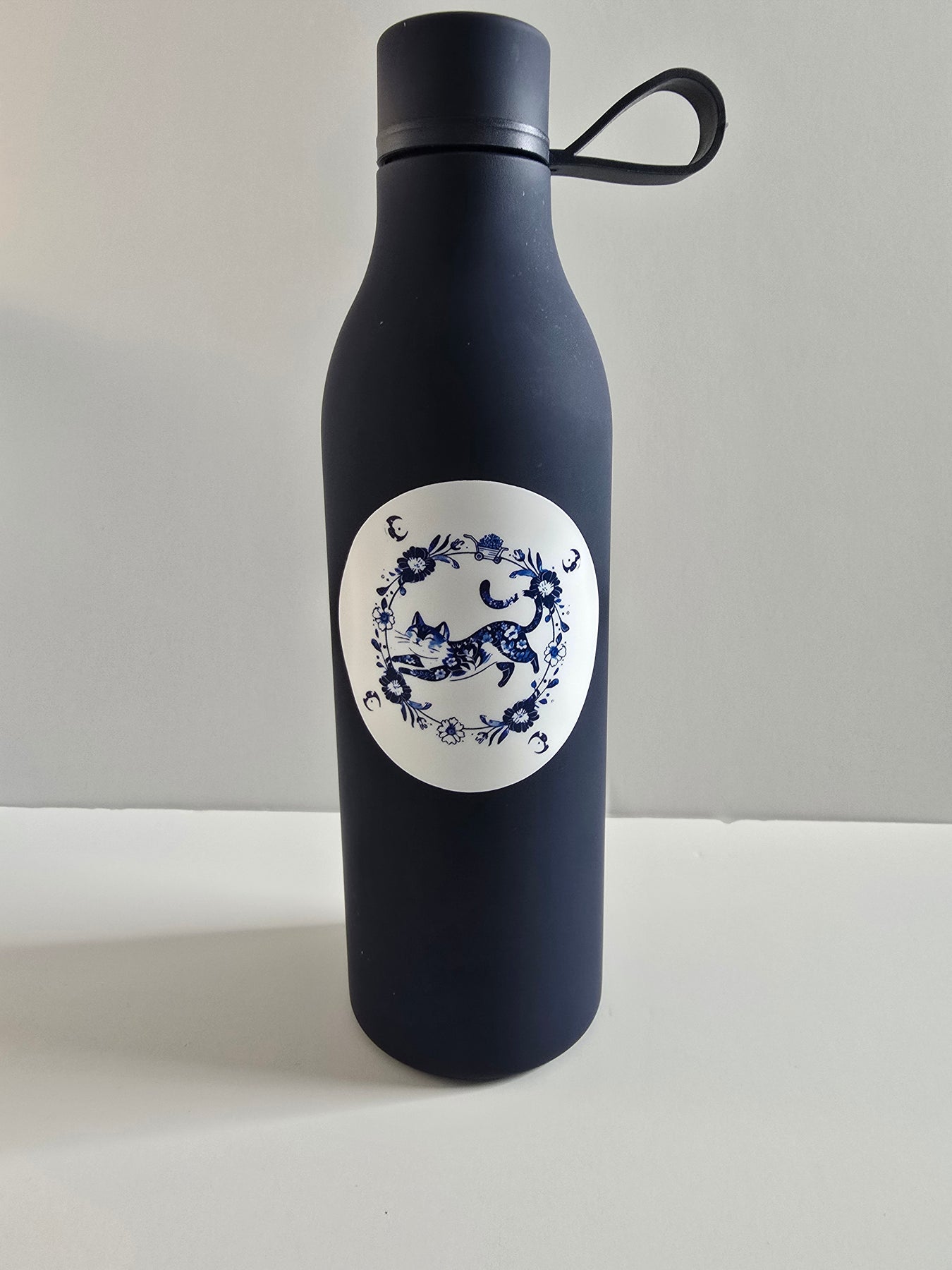 Blue Floral Cat Sticker – Porcelain-Style Vinyl Decal for Cat Lovers