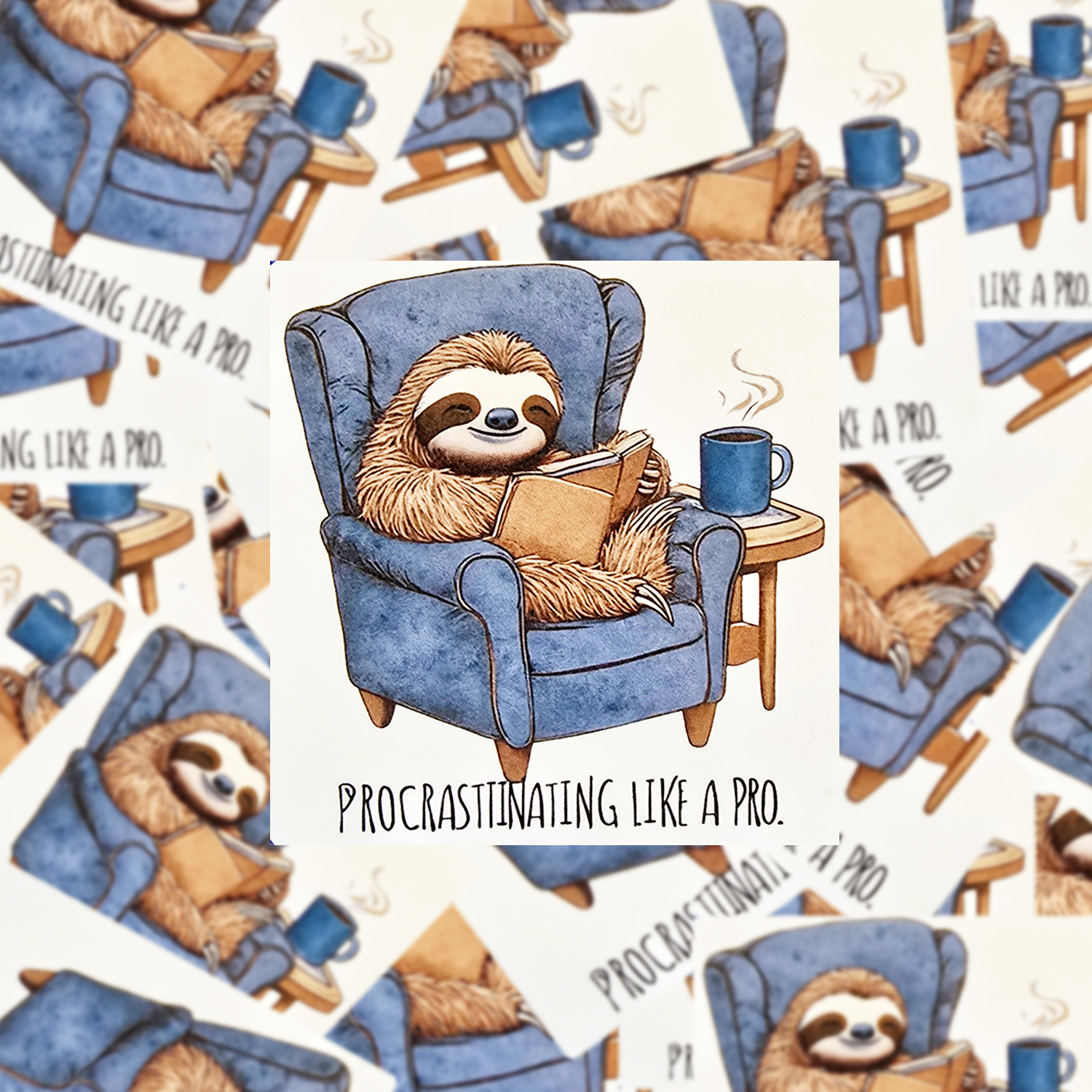 Celebrate your chill side with this adorable “Procrastinating Like a Pro” sloth sticker! Featuring a relaxed sloth reading in a plush blue armchair next to a warm cup of coffee, this design is the ultimate mood for bookworms, introverts, and professional procrastinators.