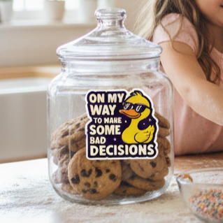Embrace your wild side with this hilarious “On My Way to Make Some Bad Decisions” duck sticker! Featuring a cool duck rocking sunglasses and bold retro lettering, this sticker is perfect for anyone who loves to keep things fun, spontaneous, and just a little chaotic.
