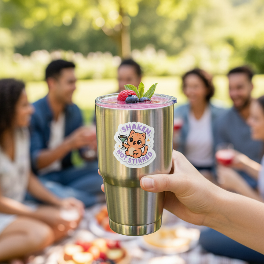 Add a splash of fun to your collection with this adorable “Shaken, Not Stirred” cat sticker! Featuring a cute orange kitty holding a martini glass with a cheeky smile, this sticker is perfect for cat lovers who enjoy a good cocktail and a good laugh.