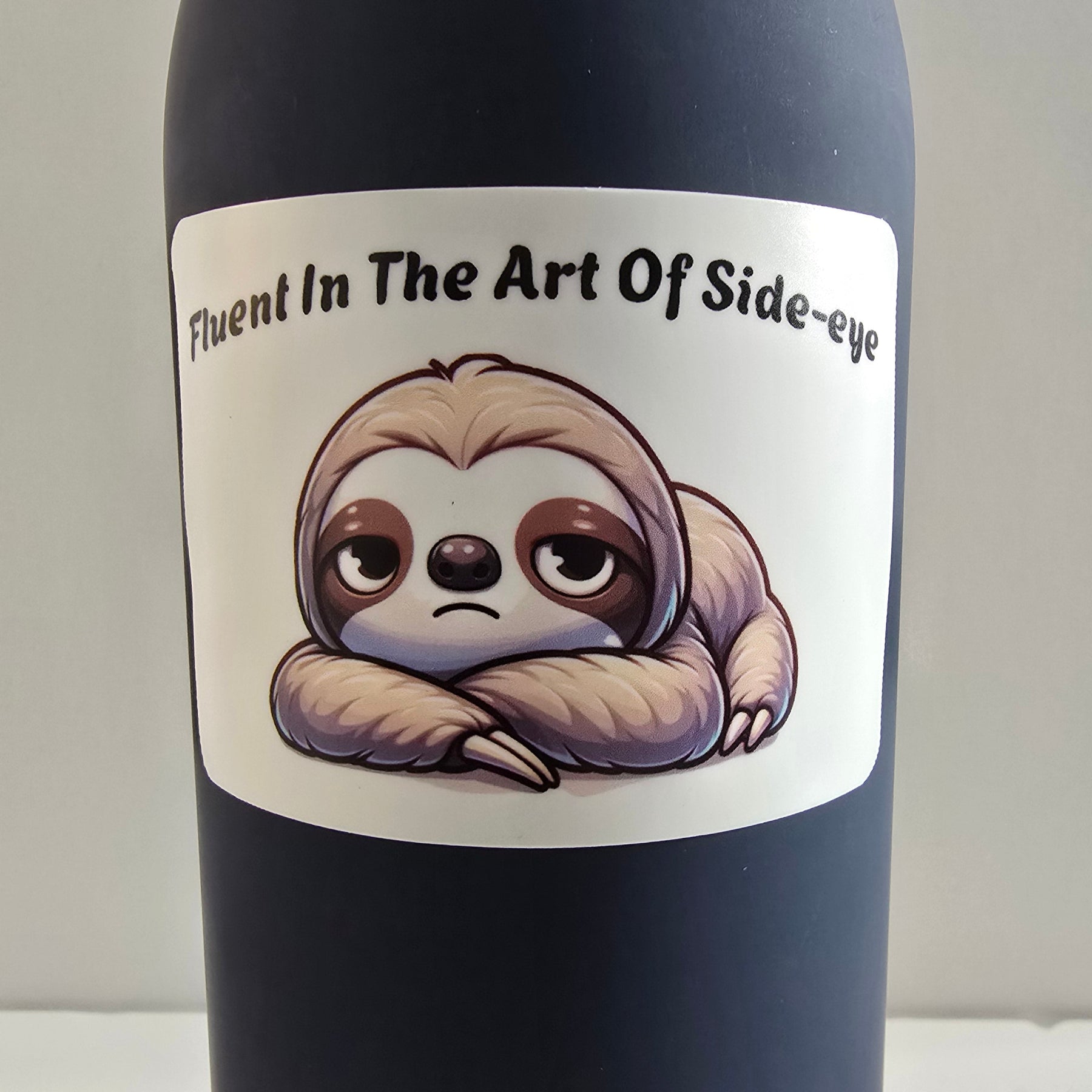 Master the art of sass with this hilarious "Fluent in the Art of Side-Eye" Sloth Sticker. Featuring a grumpy, unimpressed sloth with arms crossed and eyes glaring sideways, this sticker speaks volumes without saying a word.