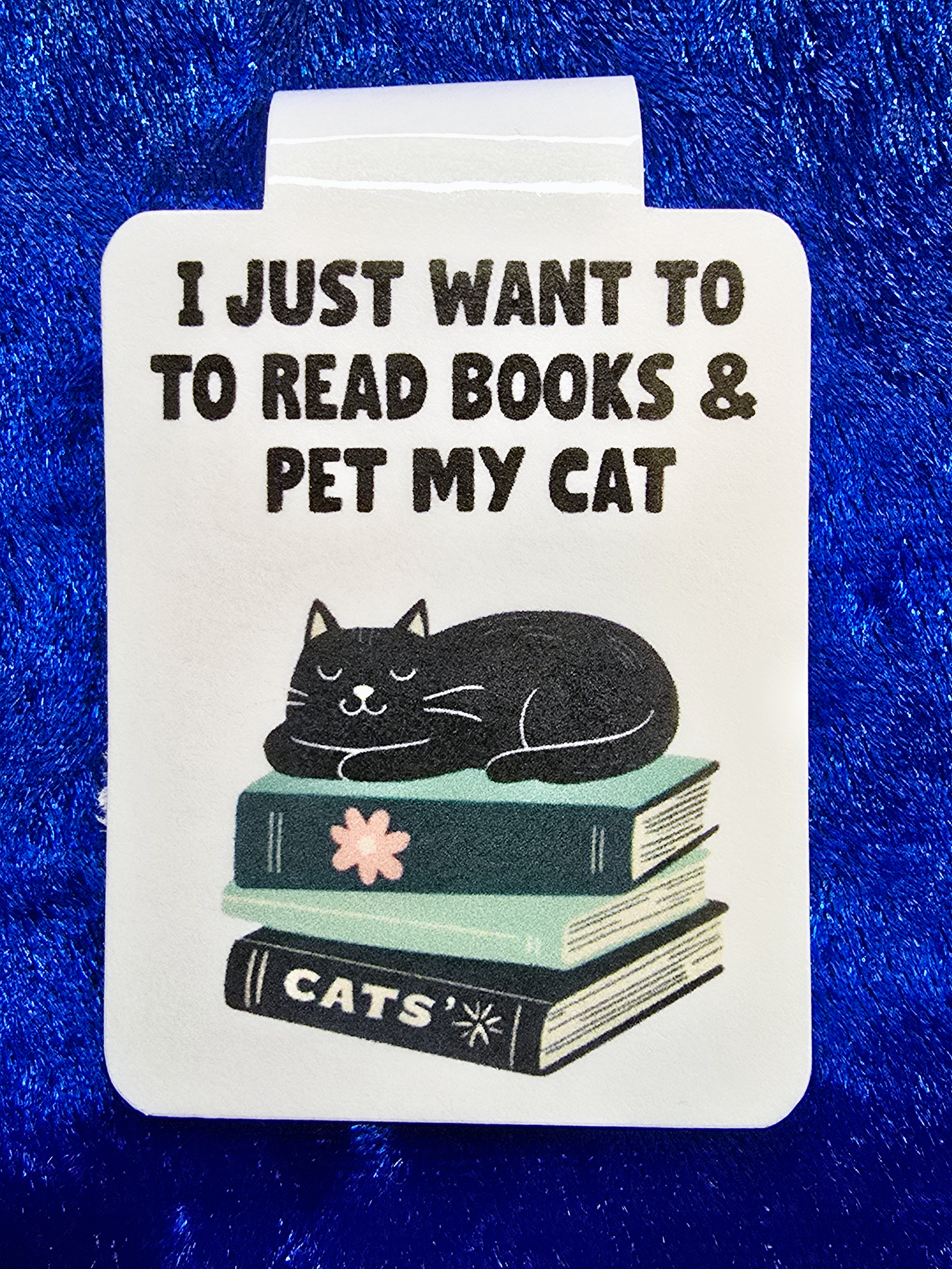 Calling all bookworms and cat lovers! This playful bookmark says it all: "I just want to read books & pet my cat." Featuring a cute black cat lounging on a stack of books, it’s the perfect companion for your favorite reads.