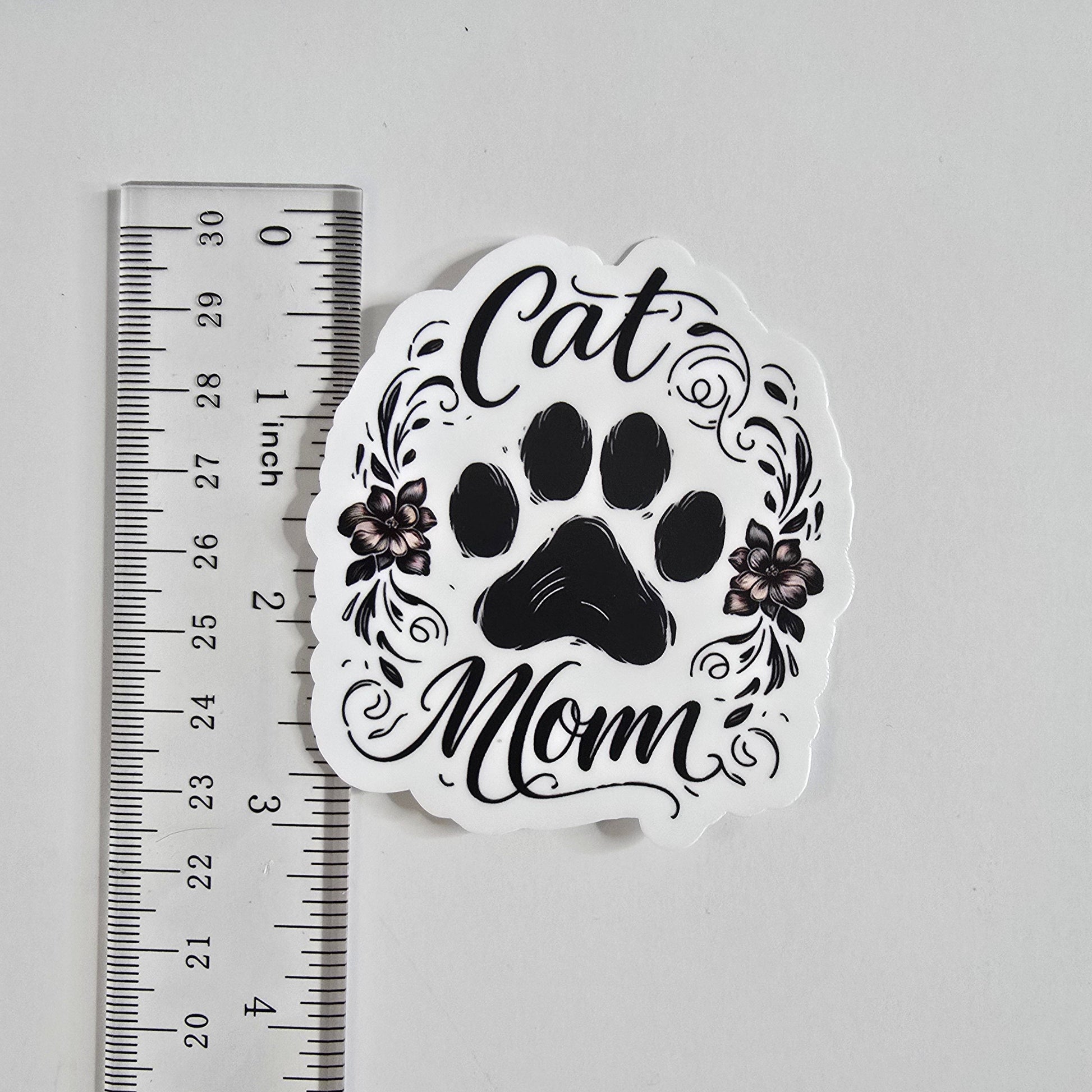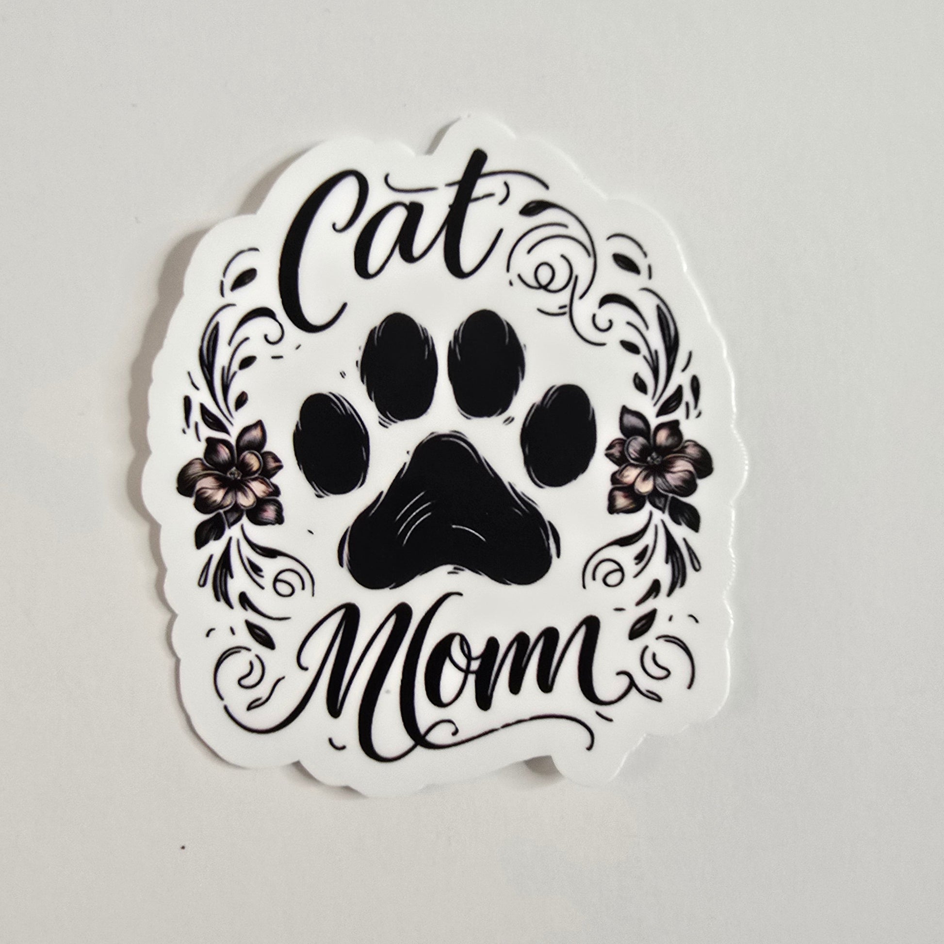 - Design: Black paw print with floral swirls and "Cat Mom" in elegant script