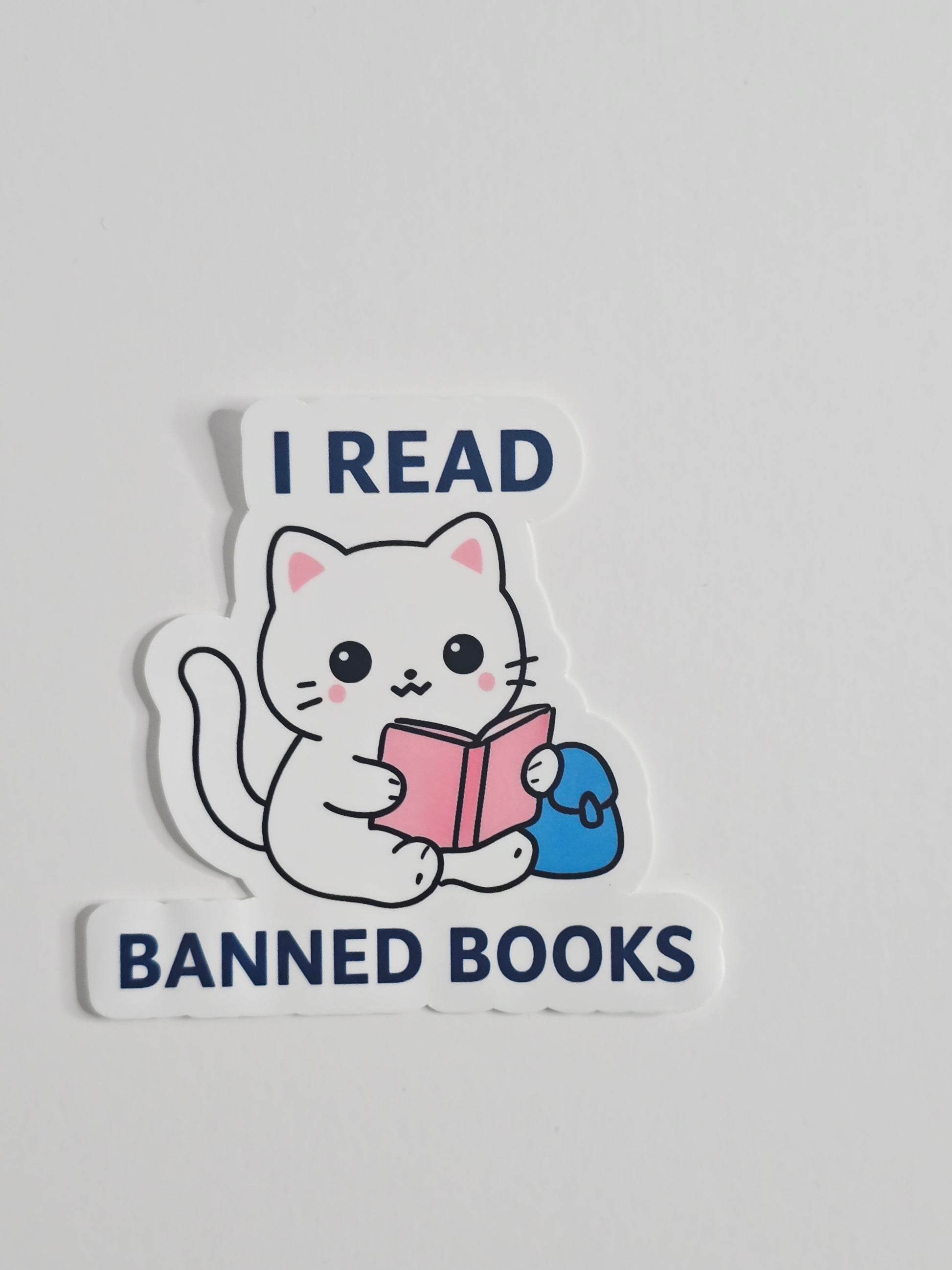 I Read Banned Books Sticker – Cute Cat Reading Vinyl Sticker – 3" Die-Cut, Water-resistant