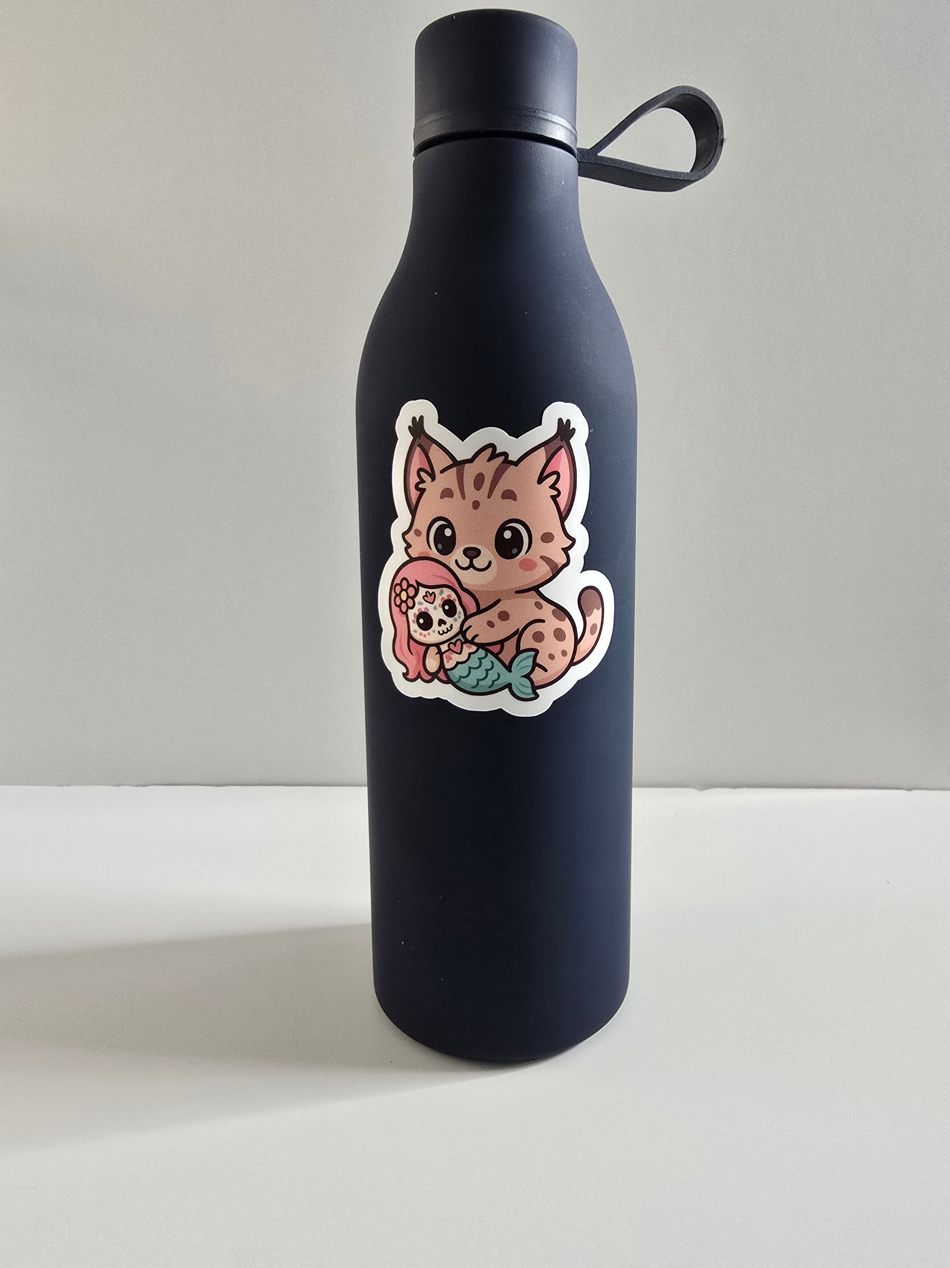 This charming Lynx Hugging Mermaid Sticker brings cuteness and culture together! Featuring a sweet cartoon lynx cuddling a plush sugar skull mermaid doll, this sticker is inspired by Día de los Muertos and perfect for cat lovers, animal fans, and folklore art enthusiasts alike.
