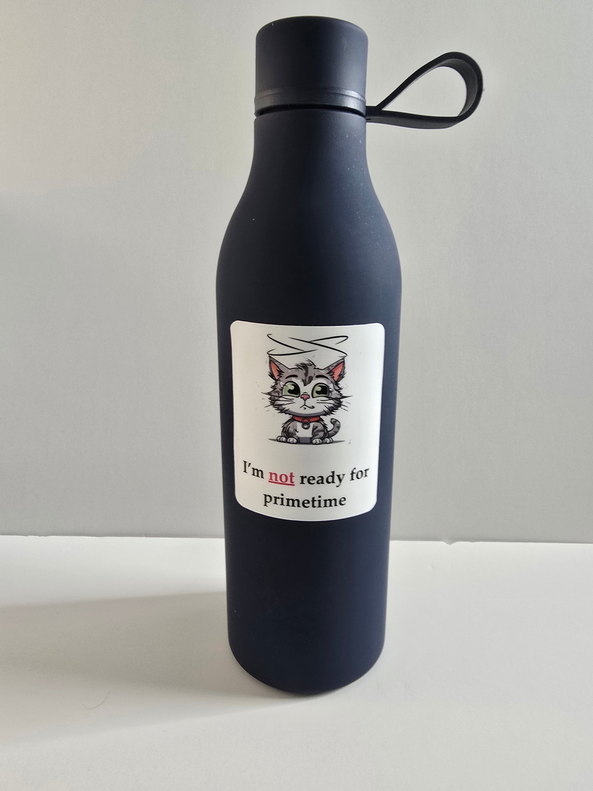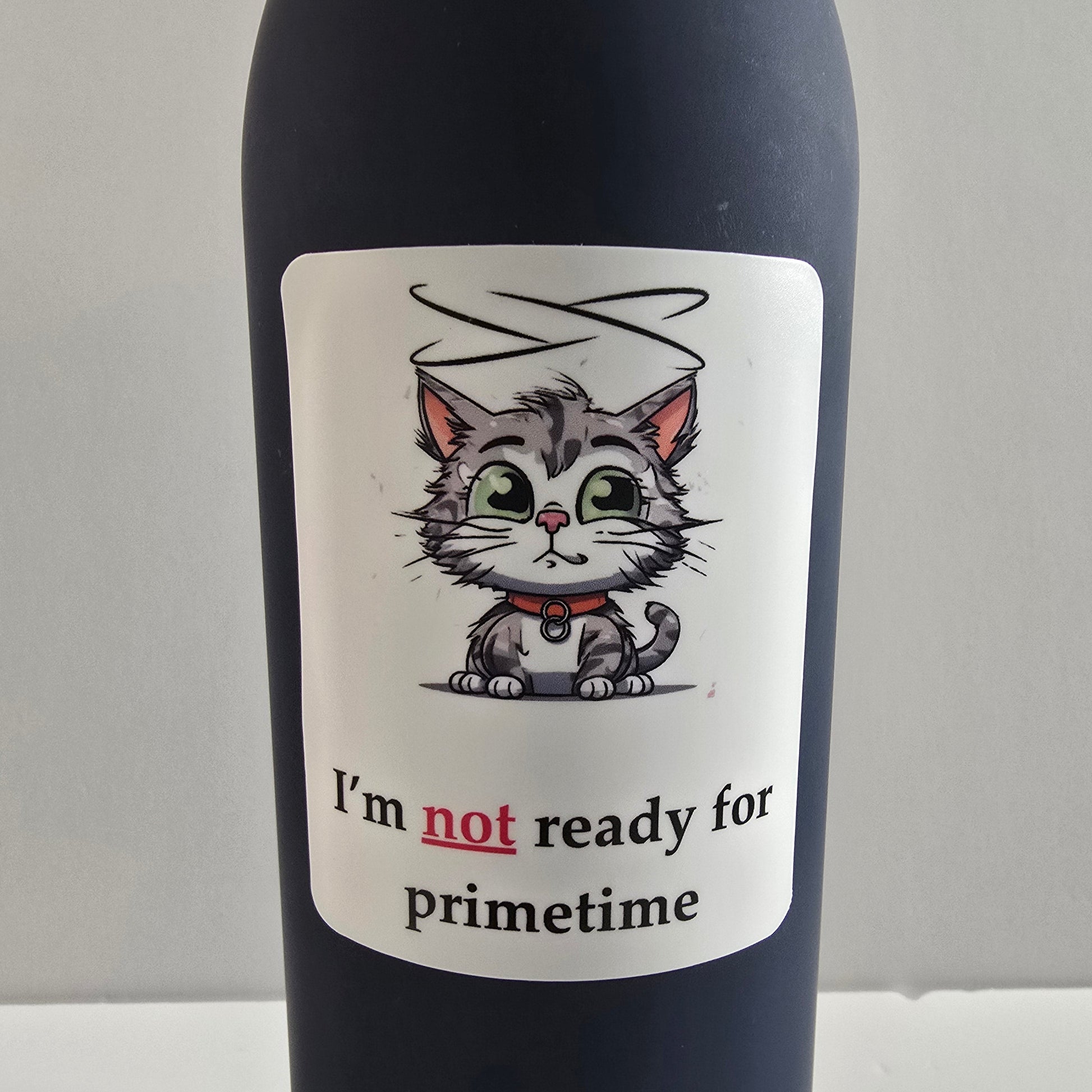 - Design: Grey and white cartoon cat with a halo, text reads “I’m not ready for primetime”