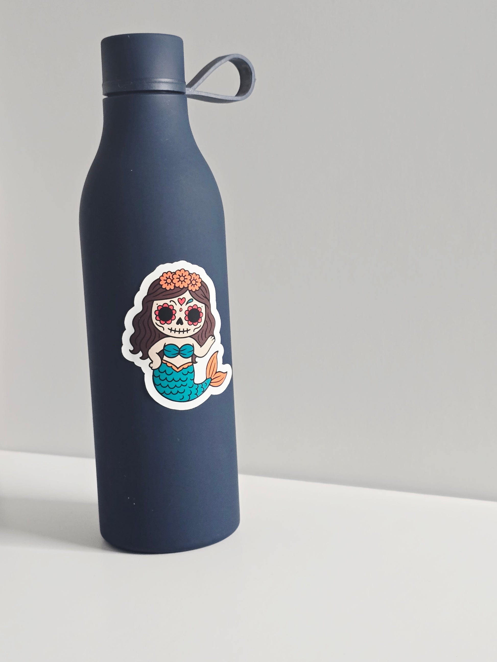 Sugar Skull Mermaid Sticker – Día de los Muertos Kawaii Sticker – 3" Die-Cut, Vinyl, Water-Resistant