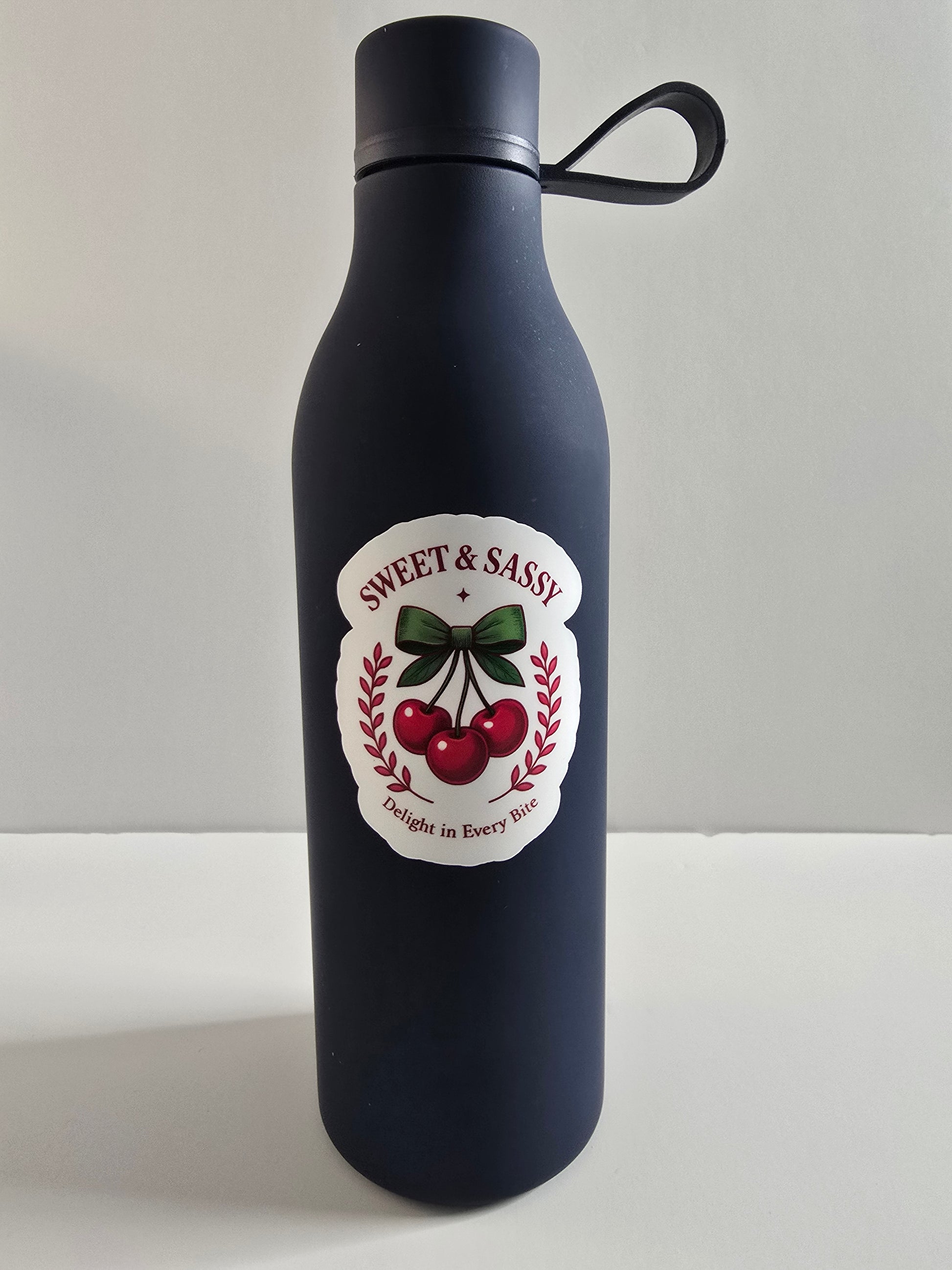 Bring a bold pop of personality to your favorite surfaces with this Sweet & Sassy Cherry Sticker! Featuring three vibrant red cherries tied with a charming green bow, flanked by botanical accents, and framed with the phrases “Sweet & Sassy” and “Delight in Every Bite,” this sticker is perfect for lovers of retro aesthetics, fruit-themed designs, or cheeky vibes.